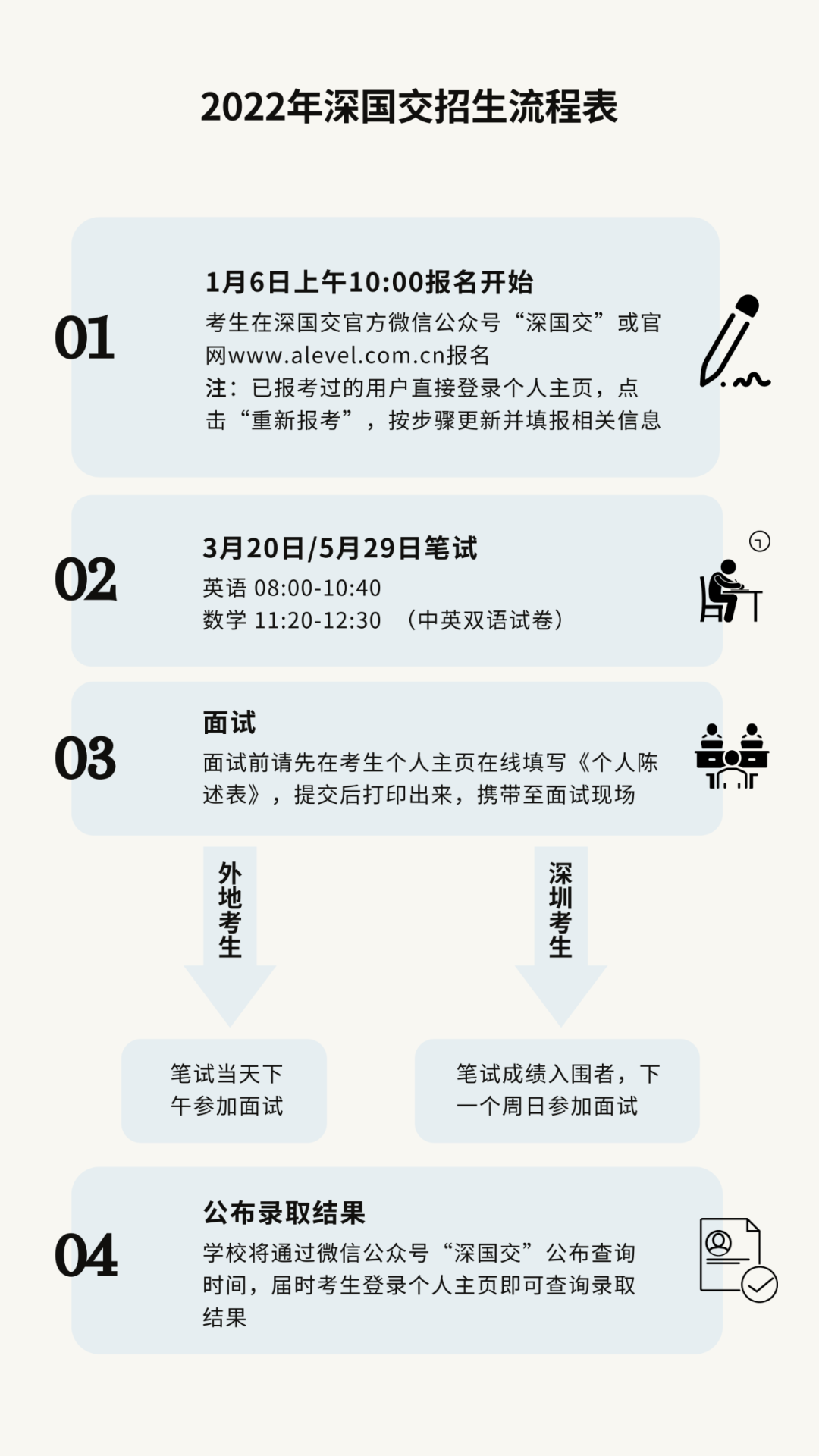 6月5日,深国交2022年第二轮招生考试结果公布,今年深国交的两轮入学考正式画上句号。恭喜拿到深国交录取的同学,即将进入的同学们一定要看完以下文章。深国交新生必看关于深国交入学后如何适应,如何学习等,深国交专门设置了家长问答栏目,对于深国交的新生,他们也提出了不少建议,小城给大家列举几个:1、G1和A1的新生,将面临哪些挑战?我们先来看看学校给报考G1和A1学生的建议,学生可以选择读完高二考A1,但深国交更推荐初三毕业考G1。相对而言,从G1开始入读,学生在语言方面、学习思路塑造、课外活动等方面具有更多的适应时间和机会,而A1开始入读,所面临的挑战会更多。2、新生进入深国交,一般要适应多久?对于新生适应,学校给出的第一个建议是:“对于新生来说,要适应深国交的教学主要难点在于对英文教学的适应,