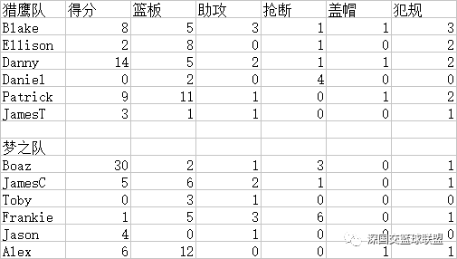 这应该是这个学期最后一次的公众号了,转眼间SBL的总决赛也结束了,可能是文笔不好的原因,吃瓜观众的我只能用精彩来形容。先送上本场比赛的数据统计:接着就好好总结下比赛吧。虽说最后梦之队赢得了最后比赛的冠军,但是两支球队都给我们带来了最精彩的视觉盛宴(毕竟是时间打得最多的一场,4节的赛制)刚开始,双方队员就打得非常热血,节奏明显比以前的比赛加快了很多。从第一节到第四节,双方的分差几乎没有怎么拉开过。其中得分最多的就是Boaz了,无论梦之队的哪场比赛,只要他出现,几乎都是队里当之无愧的MVP。 还有就是梦之队的队长James,整场比赛三分手感火热,接到Boaz的传球就是投,宛若汤神附体,比赛以后自己评价自己 “真能蒙”,但怕是这个蒙的水平能进NBA吧。还有临时请来,第一次上场的