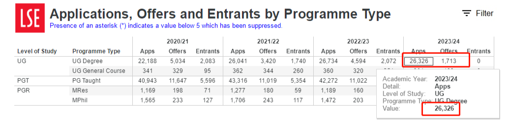 “英伦女神校”LSE伦敦政治经济学院,作为G5院校之一,是非常多同学的梦中情校。但是,她一直以来有个槽点:排名不出彩。△2023年QS世界大学排名:第56名△2022年QS世界大学排名:第49名△2021年QS世界大学排名:第49名虽然这次2024QS排名升至了第45名,相比其他G5院校来讲,排名还是偏低。然而,从录取率来看,却比牛剑都要难很多。LSE在2023/24年的录取率竟然只有6.5%,也就是说100个人里面才录取不到7个人。那么LSE2023/24申请季的申请情况如何?哪些专业最热门?被录取需要达到什么样的条件?一起来看看吧!01LSE最新录取数据录取率比牛剑还低!在2023/24年,LSE共收到26326份申请,发放了1713枚offer,录取率为6.5%。(图源:tabl