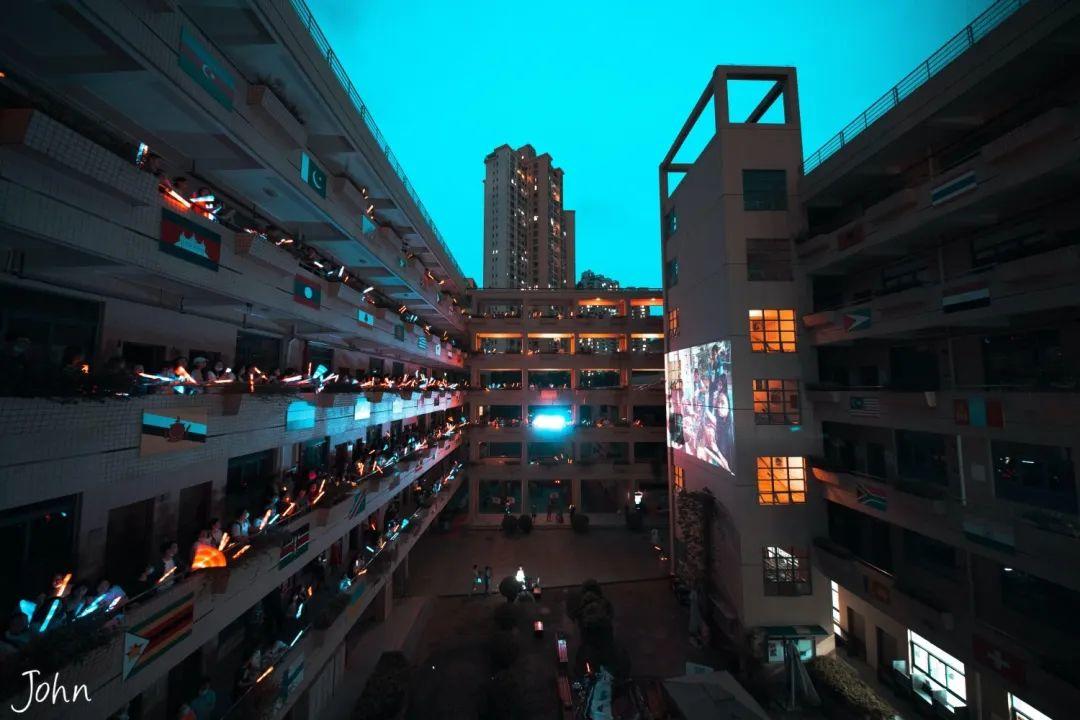 天色逐渐暗淡,等待着学生们的是深国交的传统项目——喊楼。同学们在领取了学长团准备的荧光棒后,上楼等待活动开始。