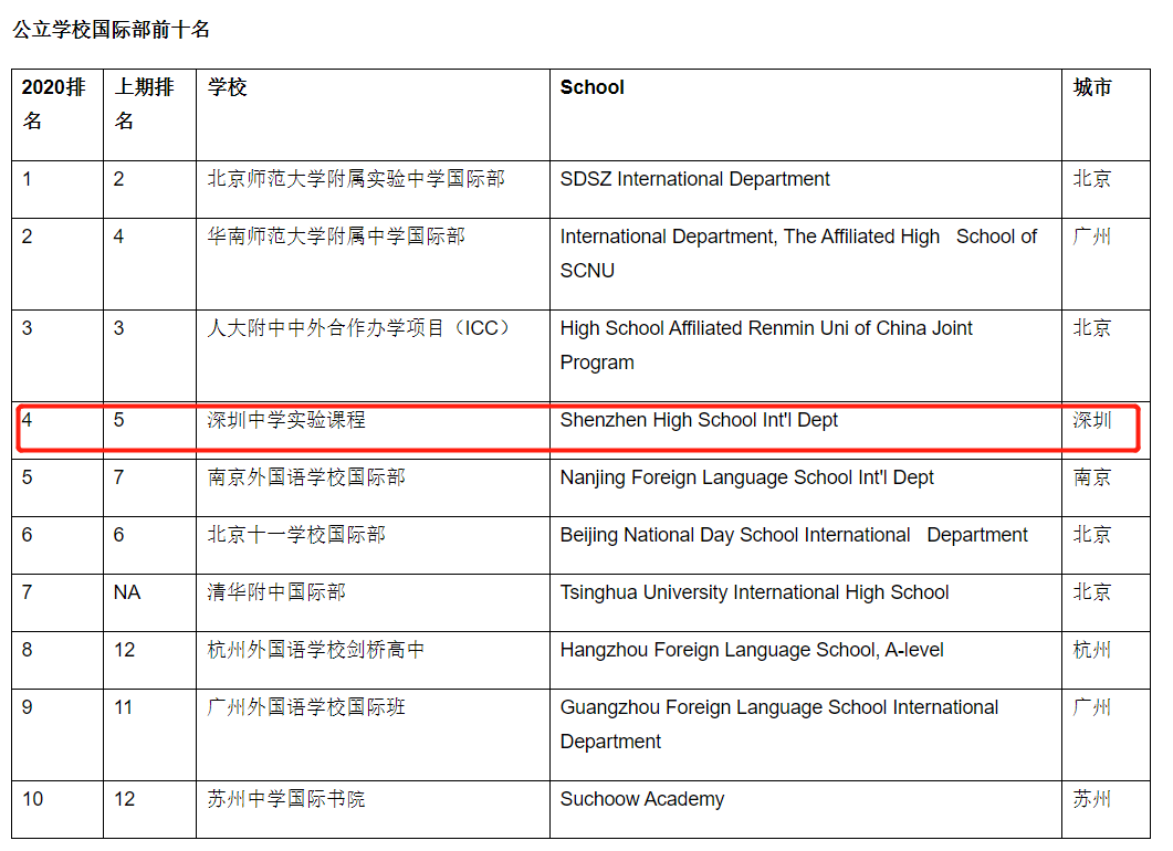 在《2020胡润百学·公立学校国际部前十名》中,深中实验课程位于第4位,是深圳唯一入围的一所公立学校。