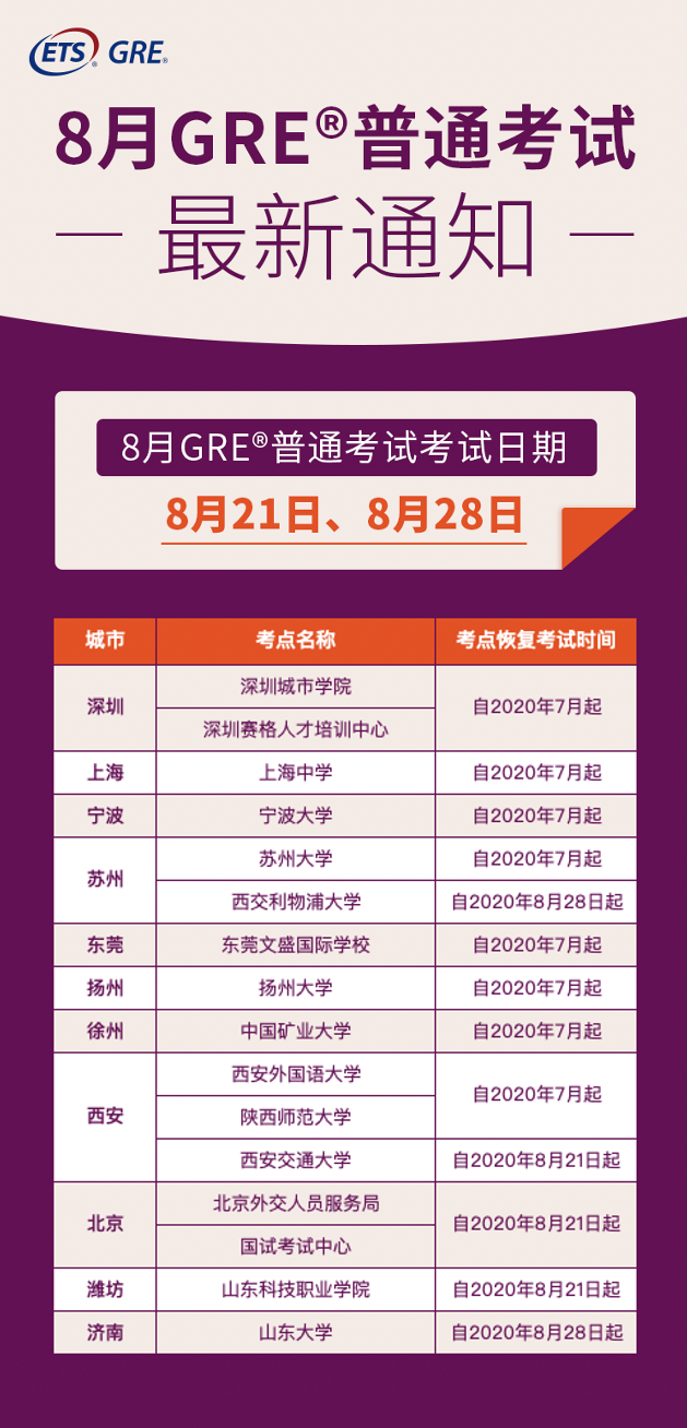 7月已恢复GRE®普通考试的考点将继续提供服务,同时8月新增6个考试考点,考点名单详见表:
