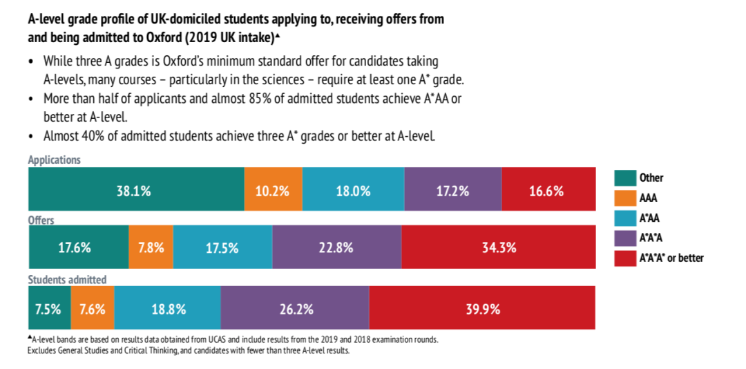 以剑桥大学为例,A Level成绩达到A*AA以上的申请者就占比94.8%(上一年数据为96.66%),其中不包括General Studies和Critical Thinking等科目。