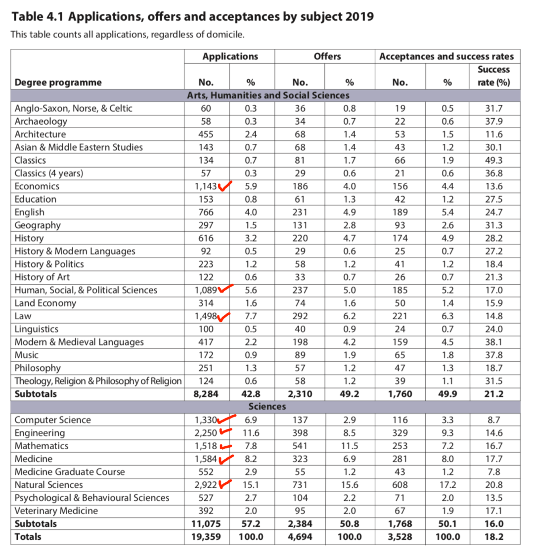 有意思的是,从整体申请数据来看,牛津申请人数23,020人,比剑桥的19,359人多出3000+,但发放offer数和最终录取人数却比剑桥低几百,所以牛津的整体录取率也自然低于剑桥。