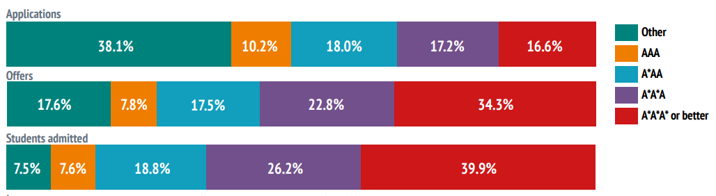 从录取情况来看,牛剑对录取者的A Level成绩都提出了很高的要求。以剑桥为例,成绩在A*AA以上的申请者占比高达94.8%。相比文科类专业,理工科专业对学生的A Level成绩要求更高,很少录取成绩不够A*A*A*的学生。