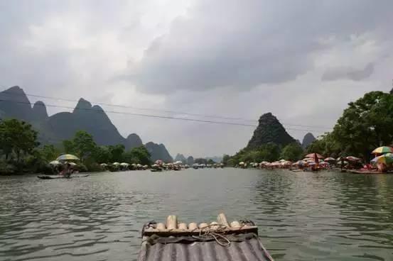 依靠在竹排上游漓江,过路的山形状各异,风不时拂过。满足竟如此简单,一阵风、一道景。