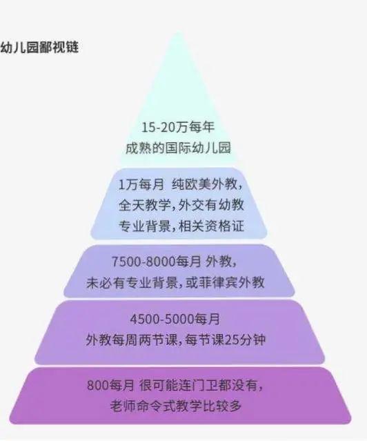前一阵子,有个新闻上了热搜,一个三四岁的小女孩,在幼儿园被孤立。然而几乎全部网友,都把矛头指向了被孤立的一方,小女孩的父母。原来,小女孩的父母,因为女儿裙子被扯坏,要求“肇事”小孩的家长照原价赔偿。这个原价竟然高达3799元。获得赔款后,小女孩就像一个易碎的花瓶,被全班“束之高阁”。没有人跟她说话,没有人愿意走近她,每个小孩似乎都受到了警告:你可别惹祸,爹妈赔不起! 事件发酵到最后,网友们不再讨论父母要求赔偿的行为是否妥当,争论的焦点渐渐滑向了:这么小的孩子,究竟该不该穿名牌?中产养娃四件套:学业、课外班、好Tony、穿名牌。 中产养娃的赛道,从幼儿园就已铺就,鄙视链跟“国际”直接挂钩。站在鄙视链顶端的,当然是知名的国际幼儿园,每年学费20万左右。其次,是欧美外教常驻的幼儿园,学费一个月1万元。再次,是拥有非欧美籍外教的幼儿园,每月学费8000元以内。再往下,是幼儿园一周两节外教课,每月5000元左右;最底端的,学费在1000元以内,当然了,没有外教。