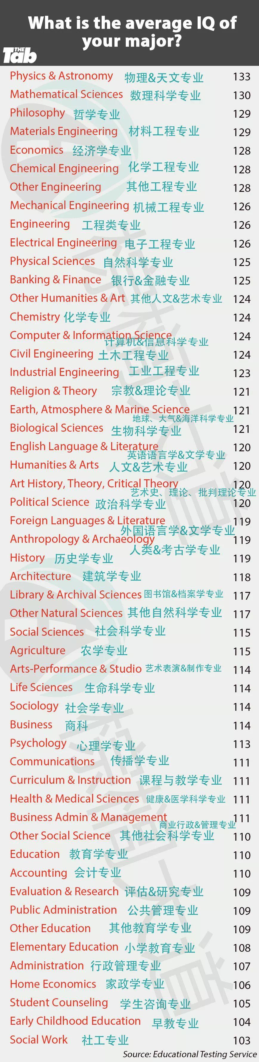 我们选择专业的时候,会参考很多指标,比如特长、爱好、就业、前景……很多同学选择某专业,也大多认为要么是自己对这个专业很喜欢、要么是它以后前景会不错。 然而,根据ETS(美国教育考试中心)的一项研究表明,你之所以选择某一个专业, 可能不是因为你的爱好、也可能不是因为这个专业的前景如何,最根本的原因可能是因为你的—— ETS 根据不同专业学生的SAT考试成绩数据,统计了美国大学不同专业的平均IQ指数。 根据Frey和Detterman在2004年的一项研究指出,SAT分数与智商测试想要测量的一般智力因素(G)之间有很强的相关性, 相关性已经达到0.82(分值区间是0-1)! 尽管让人难以相信,但这却是事实……他们因此得出了一个有效结论:SAT成绩是反映智商的一项重要标准。
