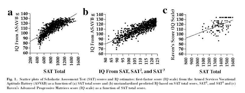 (从下面的三个图表我们可以发现, SAT的成绩越高,IQ指数就越高 )