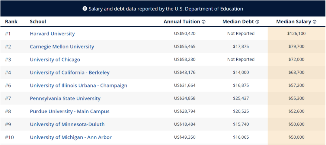 密歇根大学安娜堡分校、卡耐基梅隆大学、加州大学伯克利分校位居榜单前三甲,年薪换算成人名币均超50万。