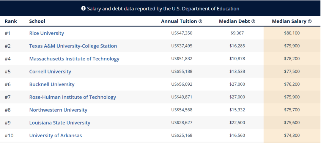 莱斯大学凭借其毕业生高达80100美元的年薪水平排名第一,德州农工大学、麻省理工学院分列第二和第三。