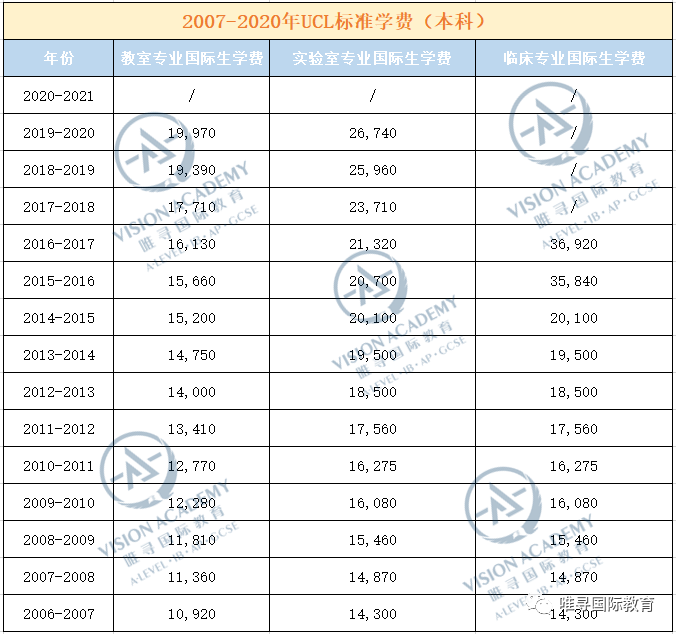 按照这一统计标准,我们来看看英国G5院校的本科学费到底都涨了多少。(注意:以下为该校该类专业的标准学费,部分专业会在此基础上有所浮动。)牛津的国际生学费增长幅度每年基本在1000英镑左右。从2007年至今,每个专业类别的费用涨了一倍左右。值得注意的是,2020年入学的临床专业国际生费用比2019年涨了1500英镑,这也就表明短短一年学费涨了1.2万左右,涨的不要太快。不过就最低费用来看,想去牛津读书,学费至少也要准备在24万左右,当然,这只是学费,还没算上生活费。震惊!论最贵,G5中谁都比不过剑桥,不说跟牛津比了,就连处在伦敦的帝国理工跟它也不在一个档次上。剑桥大学2020年入学的临床专业国际生费用比2019年涨了3000英镑不说,学费不看不知道,已经飙到64652英镑了,嗯~啥概念呢?就是一年的学费能在鹤岗买4~5套房了。当然,贵也是有贵的道理,毕竟剑桥的临床专业也是世界顶尖的存在。不过这学费涨的速度绝对跑过了通货膨胀。帝国理工临床专业的国际生学费比牛津还高,所以并不是学校名气大学费就一定高,还要考虑其他因素。帝国理工的学费增长速度比牛津还快,今年各专业类别的国际生学费比去年高了2000-3000英镑,不愧是坐落在繁华大伦敦的名校,啥也不说了,就是贵!UCL和LSE情况相似,尤其是LSE因文商专业而出名,所以在实验室专业与临床专业费用上数据不全。因此大家在看着两所学校时可以参考以往的数据。- 从2007年至今,牛剑G5的学费每年以800-2000英镑的速度平稳上涨。