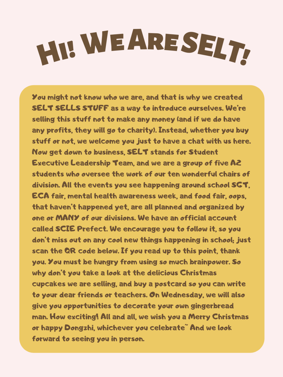 周一来找我们购买明信片并写下这些话语吧!放入我们的圣诞信箱中,我们会在周三晚上Christmas concert的时候发给大家~