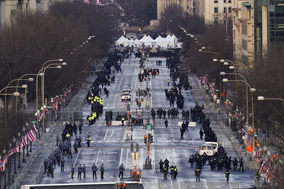 1月20日,美国华盛顿,宾夕法尼亚大道加强安保。仪式结束后,拜登夫妇按照惯例沿宾夕法尼亚大道从国会大厦前往白宫,但大道两旁的“人山人海”将被官方护卫队代替。