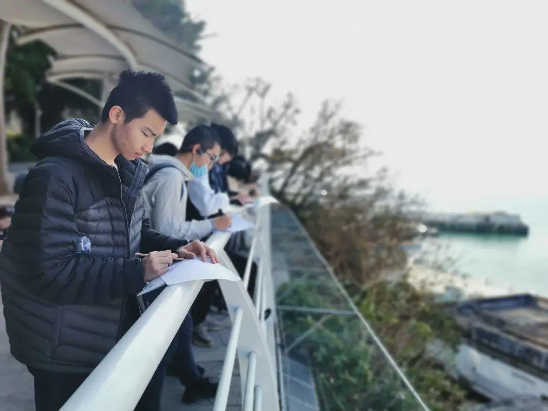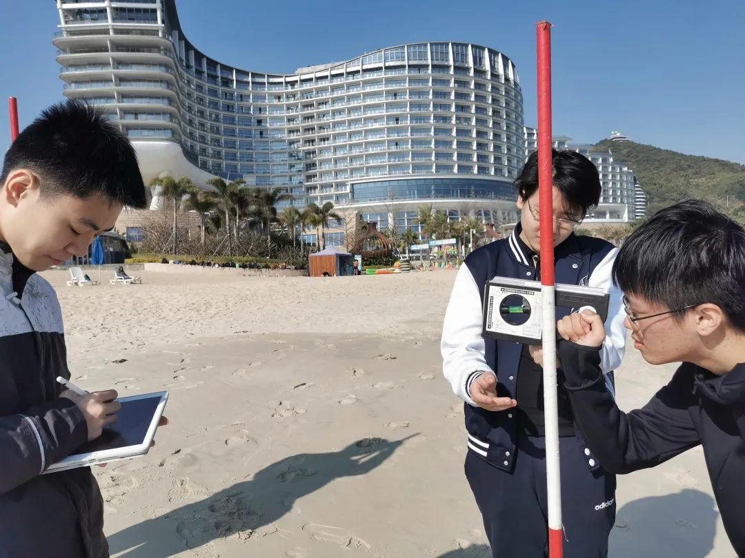 大巴车穿梭在繁华的闹市区,向着宁静的郊区驶去。窗外的景色从混凝土中透出点点远山逐渐变成郁郁葱葱中现出点点灰白。一段又一段隧道过后,喧嚣被重山阻隔在外,适应了黑暗的双眼突然被一片闪光刺痛——是海!即使大家都在深圳读书,平时见到的海也大多是海滨公园的海湾,见到这样广阔的大海的机会依然少之又少。海面波光粼粼,随着角度的变换,浪花更显灵动。下了车,冬日的海边无比寂静。相比于大家对于大梅沙人山人海的成见,此时的大梅沙更像是一片无人叨扰的净土。然而这片寂静也勾起了我们对于疫情期间的大梅沙旅游业的担忧。购物中心大多挂起了锁,喷泉停止了运作,酒店的停车场也剩下了大片的空地,空旷得令人有些失落。此次旅行,我们的第一个任务是调查游客对于旅游业的看法。寻找游客成为了一个难点,能否得到游客们的配合更是对于大家沟通能力的一个考验。在采访到的游客中,大部分人的年龄都在35岁及以上,以及10岁以下。绝大部分的游客都是以陪伴自己的父母或者携带自己的子女为由出来游玩的。由于是礼拜五,年轻的工作者们反而成为了游客中较少的一部分。几个月来一次大梅沙的游客占据多数,另外有少部分游客是第一次来大梅沙。令我们感到欣慰的是,所有我们采访到的游客对于旅游和生活都抱有积极的态度,并且对于大梅沙周边的环境和设施的改造表示了赞扬。当天下午,我们把目光从人文地理转移到了自然地理——海洋。作为地理学生,海洋永远都是一个常常挂在嘴边的词。海洋运动,海浪侵蚀,海滩地貌…… 但是真正的学习是要将知识运用起来。最有趣的活动当属测量沙滩的倾斜程度和关于海浪的研究。 数十米长的卷尺垂直于沙滩拉直,两根标枪相隔两米竖直插进沙砾,测量者站在一个标枪旁将目光穿过倾斜仪到达另一根标枪的相同高度,沙滩的倾斜角度就会在倾斜仪上显示。当然,这之间少不了精准的观察和分工明确的团队合作。研究海浪则更加有挑战性。我们站在疯狂摆动的漂浮垫上,把两根拼接在一起,长短不一的两根木棍中的其中一根插进海底,当海浪掠过较短的木棍时,木棍的顶端会产生一个夹脚,当海浪的冲流角度比回流角度大时,海浪将会是堆积性的,反之则是侵蚀性的。工作之余,站在沙滩上,洁白的泡沫在接触小腿的瞬间被打散又在腿肚后合拢;海浪回流时,沙砾被水流带动,在脚趾之间的缝隙下空出小坑,粗糙的沙砾与脚面摩擦,竟让人有些痒痒;海风徐徐,带着些许咸与苦涩的味道冲进口腔;天空万里无云,海面浩瀚无边,耳边仅剩规律而动听的海浪声……旅行的第二天,我们走上了新修建的海滨栈道。上午的阳光格外明朗,栏杆上的太阳能板正在竭尽所能发电。紧邻大海,是修建在悬崖顶上的高档别墅。对于这种别墅,许多人表示羡慕和渴望。然而当我们看到在悬崖的岩壁上,有用混凝土建造的防止山体滑坡的方格状加固措施,以及包裹住整个岩壁的防护网时才意识到,海浪的侵蚀作用将会是对这个别墅的巨大威胁。除此之外,我们还发现海岸上的石头也又一些独特之处。在海浪能够触及的地方,石头基本上是圆滑的。这是由于海水的摩擦力使得棱角经过常年的冲刷而被磨平。由于我们所在的海岸面向南方,所以白天的大部分之间都在经受阳光的暴晒,热胀冷缩,石头的表面慢慢与内核脱离,形成了一道道深深的纹路。旅程接近尾声,在大巴车上望向那蔚蓝的海水和大理石般的海滩,我不禁去想为了保持这样一个美好的环境,人们究竟付出了怎样的努力?我又不禁感到遗憾,这样美丽的地方,到了旅游的旺季,又将被无情地践踏和污染,令人触目惊心的照片也将被刊登在各大报刊上。在关于自然环境的研究上,我深深感到“路漫漫其修远兮,吾将上下而求索。” 或许这也是我们学习地理的意义所在吧。