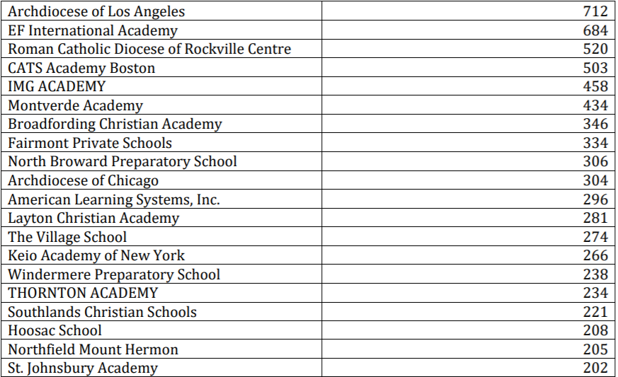 相比于大学,在K12的国际学生人数就少了许多,而且很少有我们熟知的顶尖寄宿学校,排名第一的Archdiocese of Los Angeles是一所位于洛杉矶的教会学校,国际学生人数为712人。