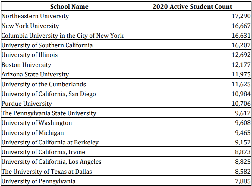 全美一共有4所学校注册F1签证数量超过1.5万名,其中人数最多的是位于波士顿的东北大学,国际学生人数高达17,290人次,紧接着为纽约大学(16,667)、哥伦比亚大学(16,631)和南加州大学(16,207)。以上4所均为私立大学。