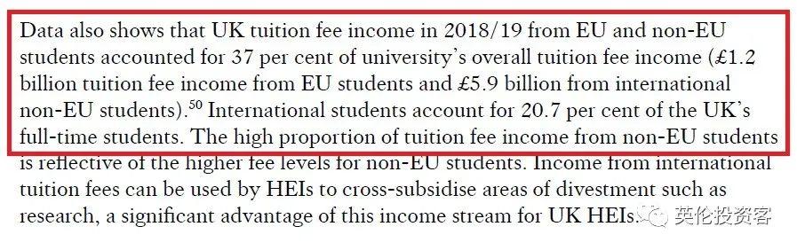 英国高等教育政策研究所(HEPI)估计,2018/19学年国际留学生的学费收入占大学学费总收入的37%,其中欧盟学生贡献了12亿英镑、非欧盟学生贡献了59亿英镑。