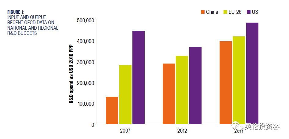 与欧盟28国及美国相比,中国过去10年的研发总投入(R&D)增长幅度最大。