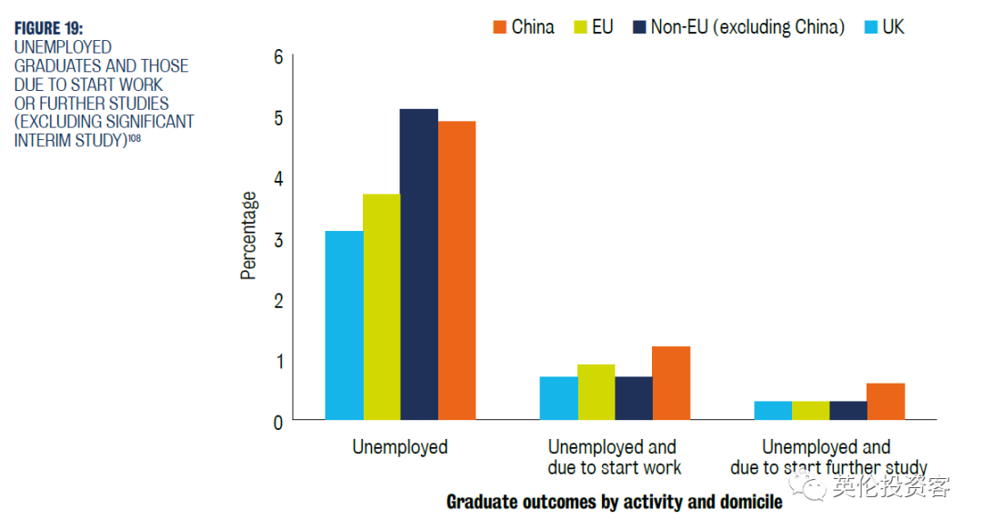 失业率方面,在接受调查的中国留学生中,有(无薪)工作和继续深造的中国毕业生占61%,失业率仅为5%,其中因找工作或继续深造而失业的中国毕业生占2%