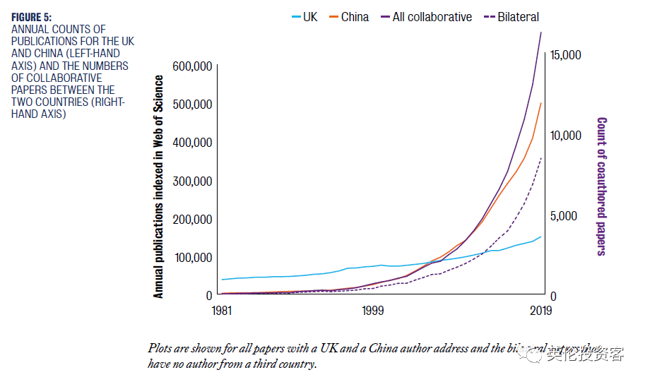 数据表明,中英合著论文数量的增长速度十分可观,从1990年前不到100篇/年,到2000年约750篇/年(约占英国总论文数的1%) ,再到2019年增至16267篇/年(约占英国总论文数的11%)。