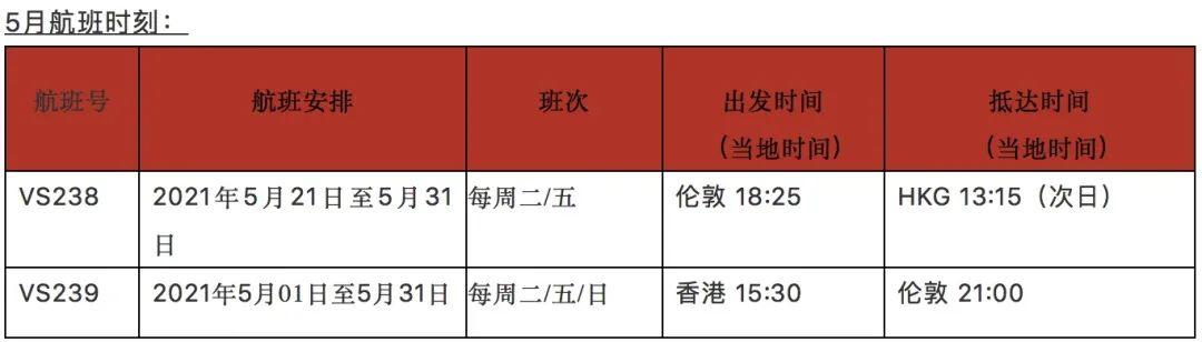 维珍航空伦敦至香港的航班:每周两班,周二和周五执飞,航班号为VS238。