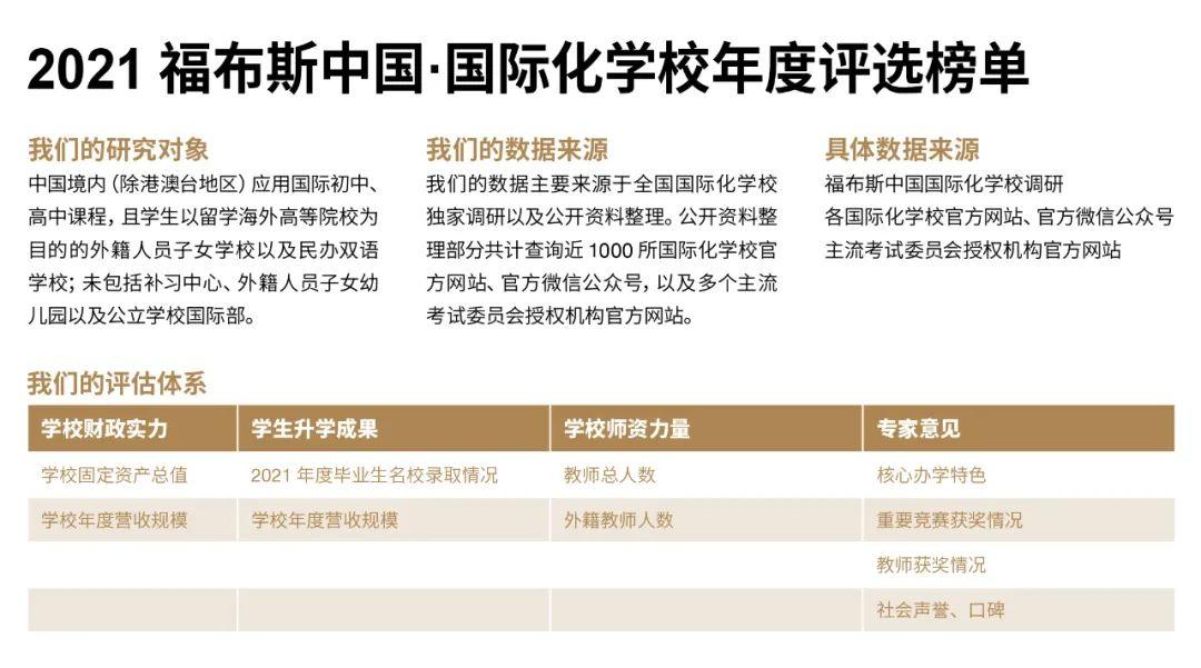 5月18日,福布斯中国联合麋麓教育集团、中国银行正式发布2021国际化学校年度评选榜单,遴选全国前100名综合实力最为优秀的国际化学校。这是福布斯中国第一次发布中国大陆地区的国际化学校榜单,通过对各所学校的财务实力、软硬件水平、升学情况、师资力量、办学特色、社会声誉等进行综合考量后,录入了来自华北、华东、华中、华南区域的百强国际化学校,力求为家长择校时提供更多有价值的信息,找到最适合自己孩子的学校,也为海外大学招生官和国际化学校老师提供更多的对比和参考。