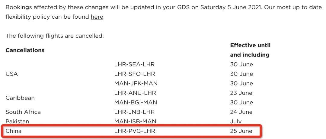 近日,维珍航空Flightstore也发布通知称:6月25日之前,维珍航空暂停执飞伦敦希思罗往返上海浦东的直航 (LHR-PVG-LHR)。