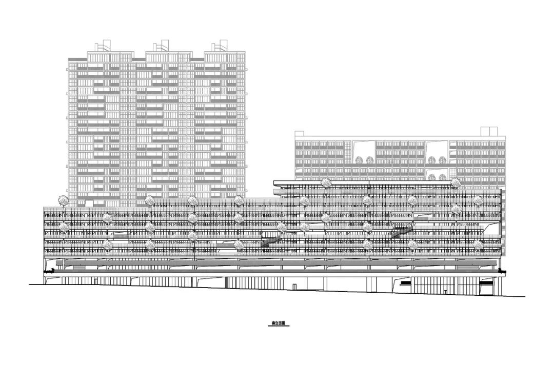 在垂直维度,将不同尺度的空间纵向叠加,形成自下而上的生长势态。平台层以下与核心庭院形成的双层地表隐射为建筑的大地区域,如同建筑的“根部”,与土壤和水景契合在一起,留有较多的活动空间,可以自由地呼吸并为其他动植物留存生长的空间。平台层外围的结构柱托举起一圈悬挑空间,与外围水系植被结合在一起成为城市的公共休闲步道。这部分区域具有较高的公共性,不仅联系校园南北两区、疏散集中人流,同时容纳体育馆、剧场、画廊、咖啡厅、接待区、办公区等大尺度空间和对外服务空间。平台层以上是单元式空间,包括8层的教学楼、13层宿舍楼以及25层教师公寓。这一区域如同植物的枝叶,密集而均匀,同时需要更多的光照,构成校园的视觉主体。相比底层地面区域的喧闹与活力,上层接近天空的单元空间更为静谧,适合私密性较高的教室和居住空间,形成均质的单元的空间。地面层与塔楼之间的虚体形成的中层空间成为建筑的“茎部”,5公里的环形跑道悬于其上,艺术教室与健身空间被设置为5个透明的异型空间,穿插在跑道两侧,成为平台空间的活动力源。不仅为校园创造了更多的室外活动场地,也是上下两种空间氛围之间的调节机制。同时,平台层也是校园内通往各个功能单元的中转站,每一个独立的交通核都是通向指定空间的端钮,结合校园标识系统和立面色彩的设计形成清晰的空间定位。