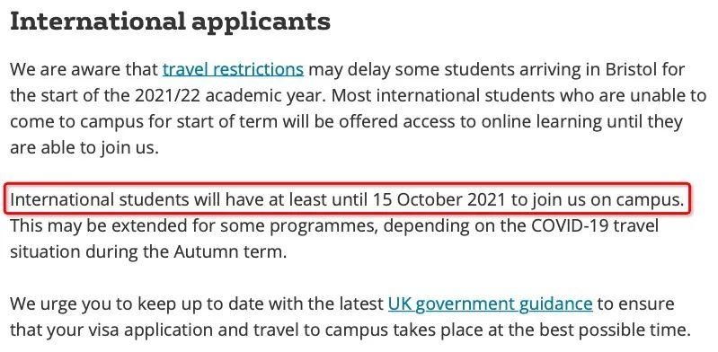 布里斯托大学允许留学生在下学期刚开始时网课,但至少要在2021年10月15日前到校,部分专业可以申请延长。