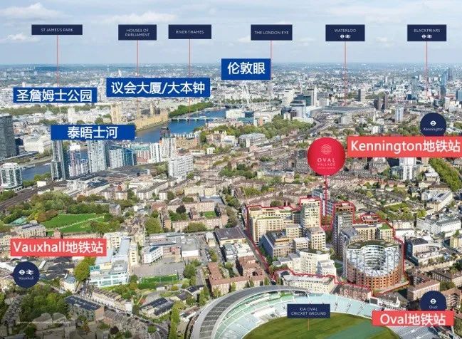 Oval Village,伦敦一区位置,与威斯敏斯特隔河相对,步行可达3个地铁火车枢纽站 (Victoria Line、National Rail、Northern Line),快速通往伦敦各处,离泰晤士河仅700米!
