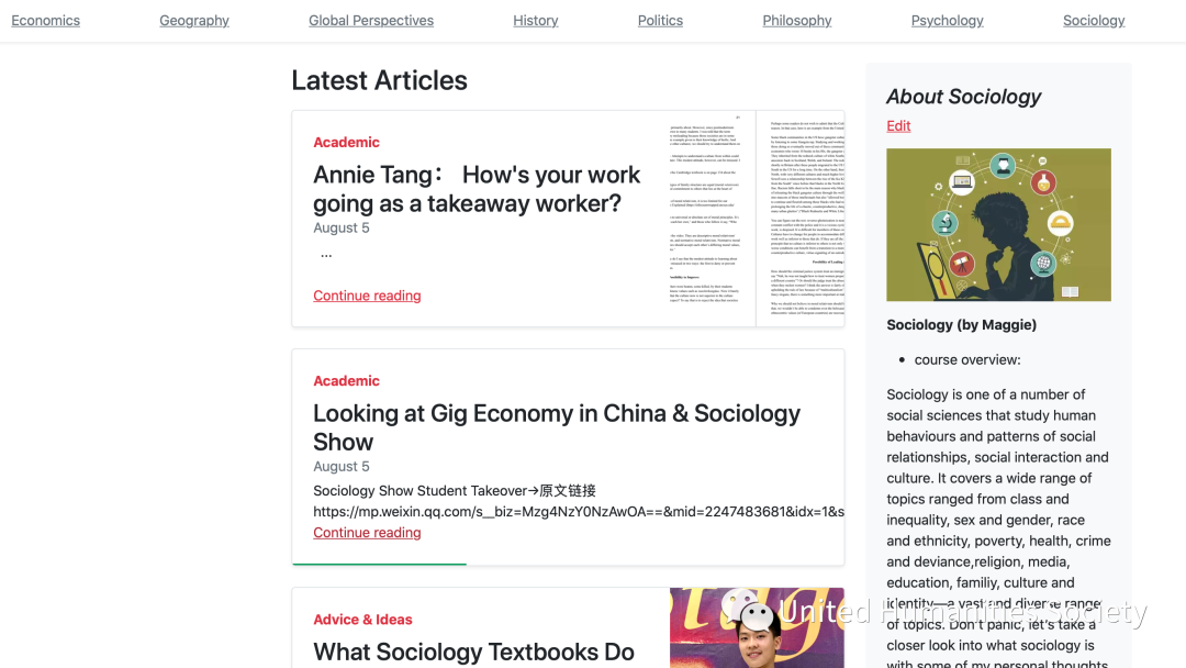 I am Maggie Liu from A2. I am the ambassador of sociology and founder of UHsoc website. It takes us nearly 4 months to build up this website and I sincerely hope it will be a great help for you throughout your whole journey of learning humanities subjects. I have gathered all information related to scoiology including: research projects I and my friends have done, interesting podcast that I have encountered, thought-provoking books I want to share, articles that are written by myself and my friends......We are glad to share our work with you in an attempt to spark off new ideas and eventually improve our work. Remember, you are not alone on your journey. Be brave and reach out!