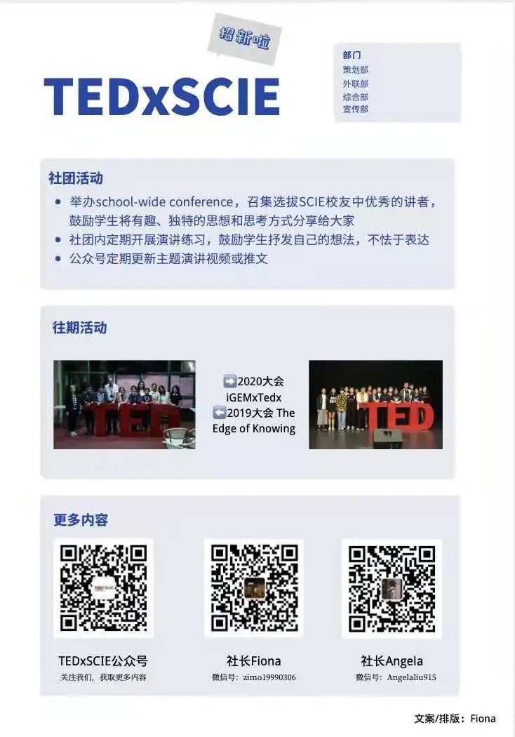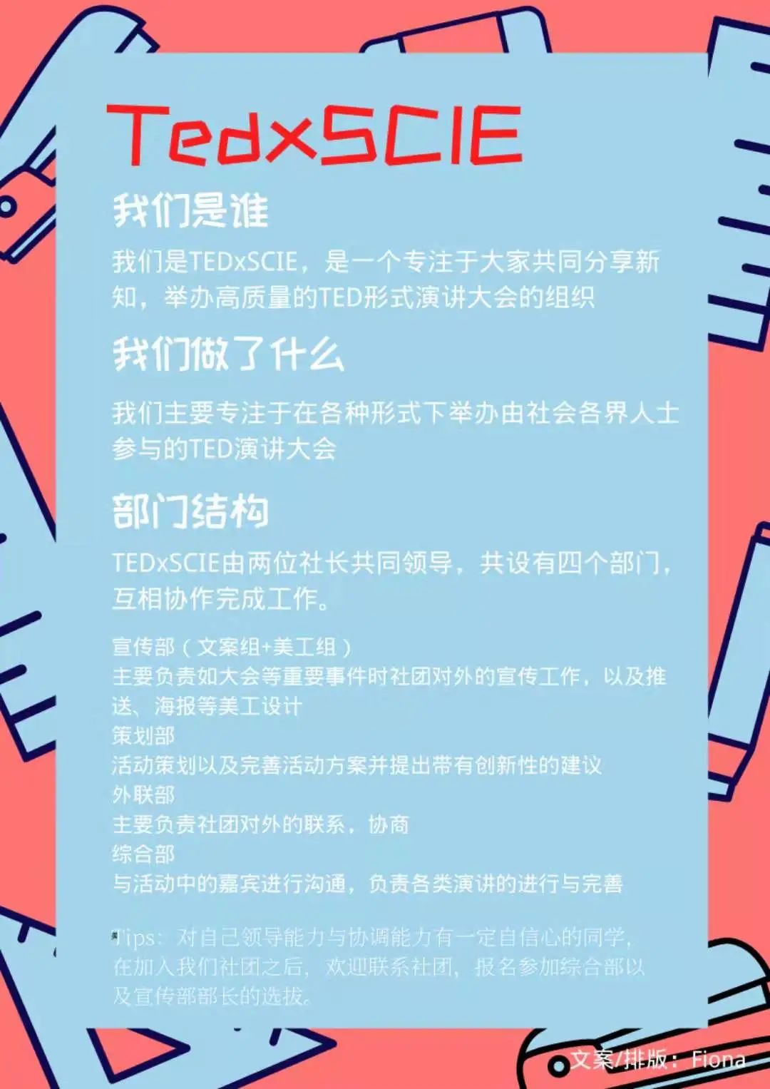 今年的TEDx SCIE将一改以往风格,在举行高质量的演讲邀请社会各界人士的同时,每一位社团建设者都可以在社团活动中学习演讲,挖掘自己最大化的价值,提升自己的演讲能力,精益求精,并且举办属于自己的社团内部演讲!大家快来踊跃报名哦~
