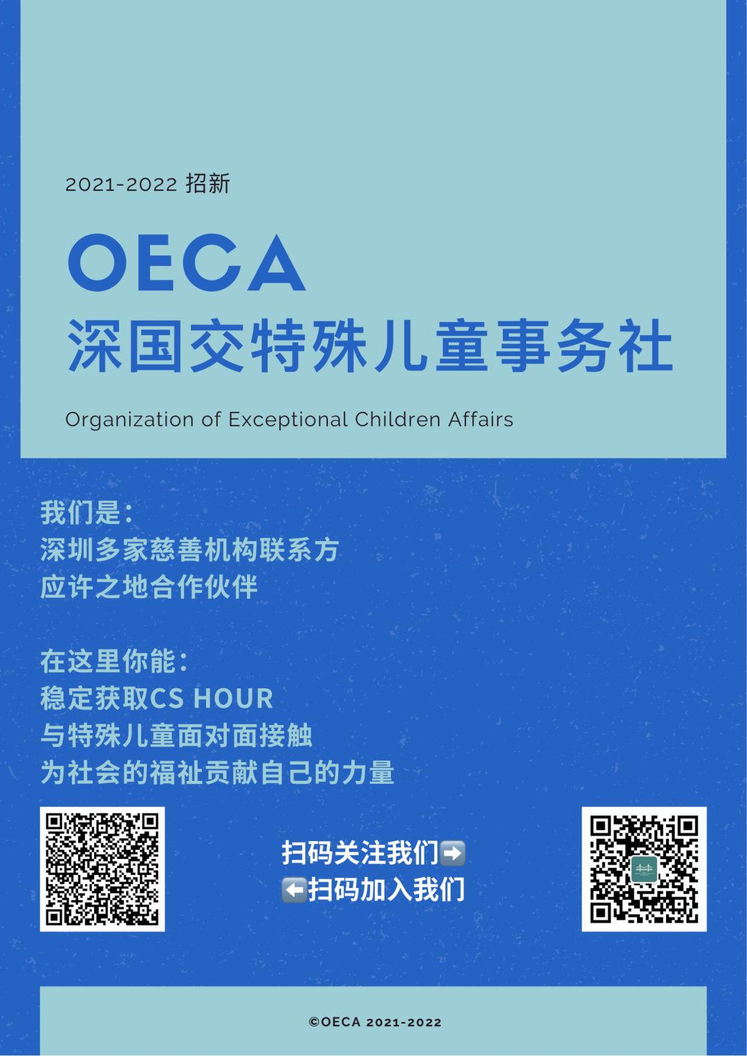 OECA招新啦!OECA全称Organization of Exceptional Children Affairs,中文深国交特殊儿童事务社,身为慈善性质社团,立志于帮助特殊儿童,专注于帮助患有脑性瘫痪的特殊儿童,希望能用自己的一份力量帮助特殊儿童获得他们应得的尊重和支持,让社会各界更好地看见特殊儿童群体的价值与生活。