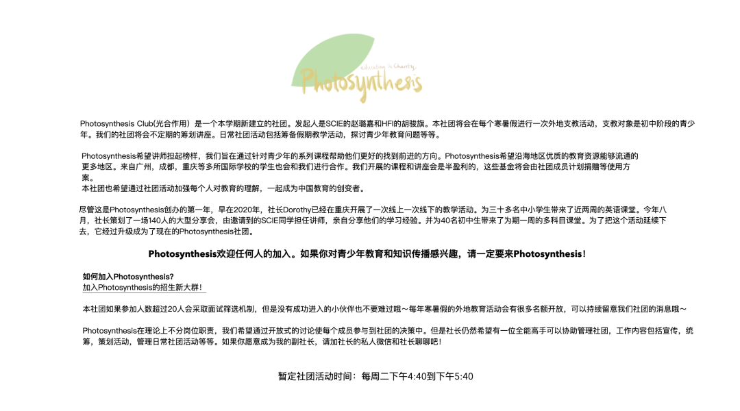 Photosynthesis(光合作用) Club是一个本学期新建立的社团。发起人是SCIE的赵璐嘉和HFI的胡骏旗。本社团将会在每个寒暑假进行一次外地支教活动,支教对象是初中阶段的青少年。我们的社团将会不定期的筹划讲座。日常社团活动包括筹备假期教学活动,探讨青少年教育问题等等。
