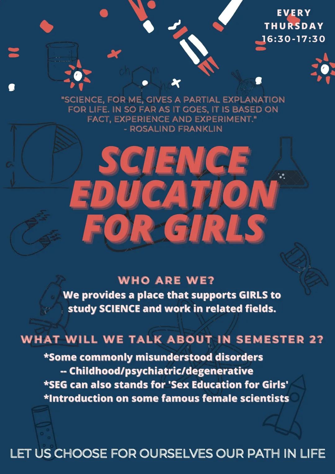 SEG是一个支持女孩们去学习理科并且在未来从事相关工作的地方,我们希望我们的活动可以使她们对理科有更多了解和激发对其的兴趣,并带来让她们选择理科的勇气。不过如果有男生想要参与的话我们也不会拒绝的。
