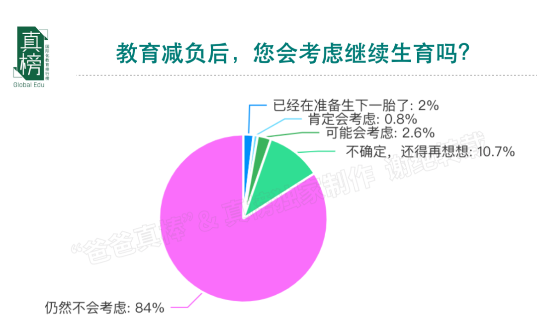 至于教育减负是否会促进生育的话题,84%家长还是一致表示:仍然不会考虑。