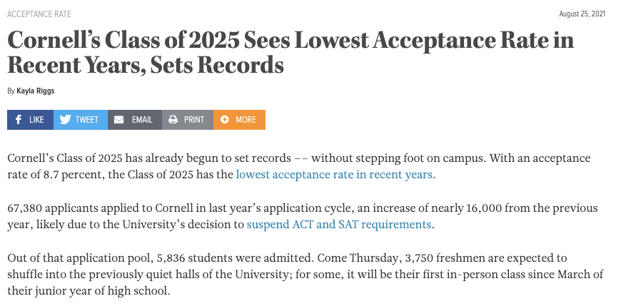 所以,对于class of 2025届学生来说,低于5%已经不算超低录取率,据学校官方统计,哈佛3.4%、哥大3.9%、普林斯顿3.98%,都已经低于4%了,就连往年“最容易”进的康奈尔大学,录取率也跌到了8.6%(往年均超过10%)