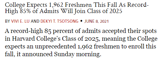 最近有外省的家长,小孩9年级很优秀,应该可以问鼎藤校,所以想了解下北师大实验国际部怎么样?这个家长看起来对爬藤毫无准备,于是我建议他如果真要刷藤校,不如找个专家先规划下小孩的学业和活动。他说,顾问真的有用吗?总感觉又贵又没用,白浪费钱。我说,你不爬藤,小孩凭优秀可以申请一个学校。但如果爬藤,还是需要专业的人士辅助,因为这真的是个系统的活儿。不仅需要搞清楚小孩适合哪所学校,还要了解每年学校录取的偏好。比如说,有两个北大同院系的师兄弟申请哈佛研究生(难度比本科低),经历相似、成绩伯仲,都很优秀。结果是第一年申请的录了,第二年申的没录。理由是哈佛不需要两个类似的学生。总会遇到一些家长对爬藤有误解,觉得自己小孩足够优秀,就能躺进哈耶普斯的本科。这其实不太可能。尤其是在近些年来,顶尖精英家庭对海外名校学历产生兴趣,携带大量金钱和资源入场,争夺几个少的可怜的国际生名额,爬藤大战日趋白热化。没有从小做规划开始准备,家庭和小孩都没有力争上游的决心,没有足量且“特别”的活动(贵)支撑文书,仅凭成绩优秀的一腔孤勇就想爬藤成功,机率越来越小。在今年哈佛大学的“新生调查报告”中很清晰地显示了这一点:20%的新生有Counselor,而其中接近50%的人,家庭年收入25万美金。所以,爬藤可以但要做好思想准备,因为在名门的世界,不是拼智商,还拼钱拼爹。很意外?其实意外的还不只是这些。分享一份更全面的哈佛“新生调查报告”解读,希望能帮助你了解更多藤校的录取逻辑。哈佛大学每年开学时,校报都会公布一份“新生调查报告”。今年共有1,537 名新生参与了问卷调查,问卷内容涉新生们的背景、生活方式和经历等。2021年申请哈佛大学本科的人数空前激增,有57,435名学生申请了哈佛大学,而只有1,968人被录取,录取率为3.43%,是哈佛大学史上最低录取率,低于2019年创纪录的2023届学生录取率——4.50%。- 2021年申请人数57,435名,录取率为3.43%,最终录取了1,969人。