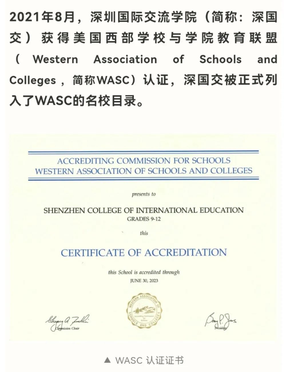 以深国交获得的WASC认证为例。WASC负责认证美国加州和亚太地区的美式大小中学,包括著名的斯坦福大学、南加大和加州大学,权威性可见一斑,被称为“教育界的奥斯卡”。