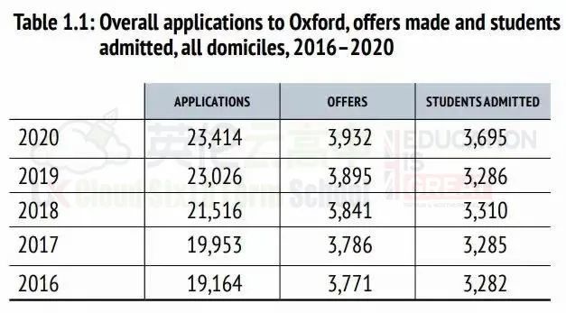 2020入学,牛津本科申请人数是23,414(23,026)人,实际录取3,695(3,286)人。