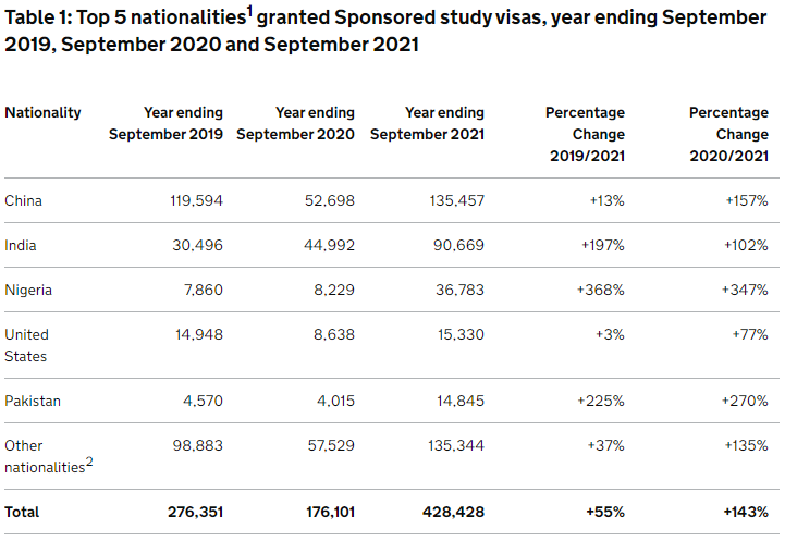 根据政府官方数据,在截至2021年9月的一年内,英国内政部共发放428,428份学生担保签证,较2020年增加143% (252,327人) ,对比截止2019年9月也增加55% (152,077人)。