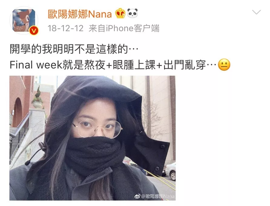 不管是在异国他乡还是ZOOM大学,想要逃过final的魔爪可都是太难了。就连如欧阳娜娜这样的明星留学生也不能幸免,熬夜+眼肿上课+出门乱穿