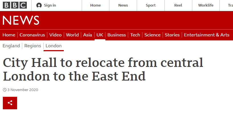 2020年6月24日,伦敦市政府确认将办公室搬迁至东伦敦皇家码头