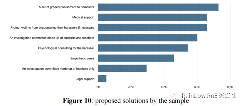 此外,大多数受访者认为,学校将反对性骚扰的机构纳入其中是很重要的。以下是回答者对于这样的机构的期待:它应该“对骚扰者实行一套分级惩罚”(72.97%);它应“在必要时保护受害者不遇到骚扰者”(65.88%),以防止受害者再次遭受创伤记忆或骚扰。