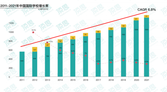 从2011年到2021年中国国际学校数量的发展趋势来看,增长已呈现逐渐放缓趋势。