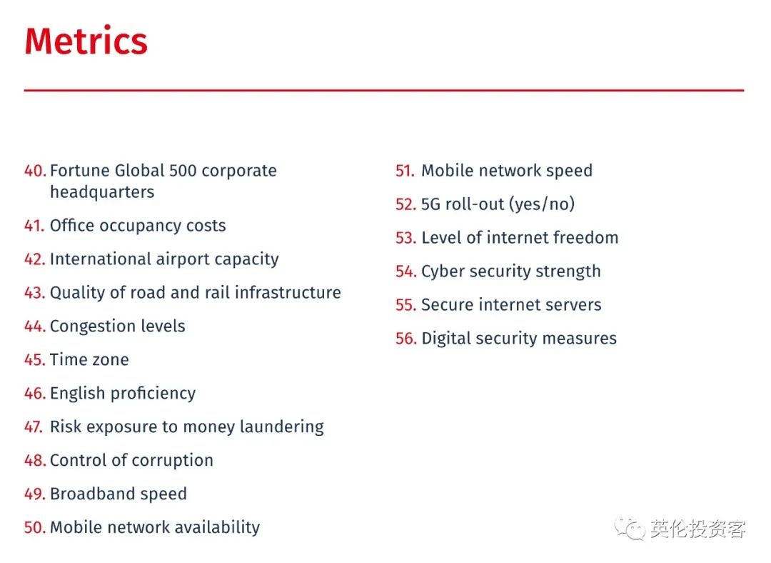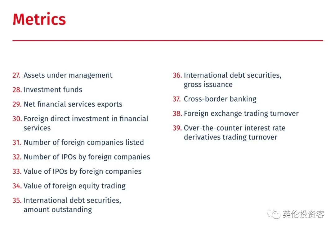 该报告考查了全球各大金融中心的综合竞争力,分别从创新生态系统、金融市场规模、基础设施、人才吸引力及营商环境5个方面打分,涵括了绿色金融活动等95个指标。