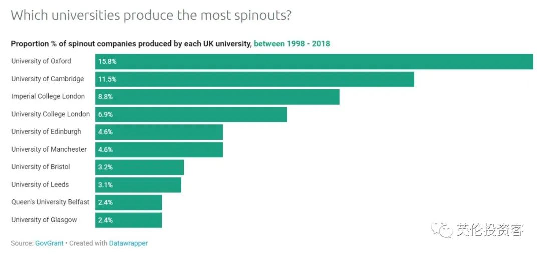 通过深入分析,GovGrant对英国各大学的科研商业化能力进行了排名。我们发现,在排名靠前的英国高校中,不乏牛剑这样耳熟能详的顶尖高校,同时也有一些令人意外的新面孔。下面,我们就来看一看,英国各大高校“知识变现”的能力如何?哪些专业更能受到资本的青睐?迄今为止,哪所英国大学衍生企业最多?通过梳理20多年的数据,GovGrant统计了迄今为止衍生企业数量最多的10所英国大学,不包括机构间合作的衍生企业。具体排名如下图所示:在最新排名中,牛津大学以明显优势居英国衍生企业大学榜首,其过去20多年的衍生企业占所有大学衍生企业总数的(15.8%)。此外,剑桥大学、帝国理工学院(IC)、伦敦大学学院(UCL)等G5院校紧随其后。值得一提的是,英格兰共有7所大学跻身前10,苏格兰、北爱分别只有2所(爱丁堡大学第5名;格拉斯哥大学第10名)和1所(贝尔法斯特女王大学第9名)。过去10年中,哪所英国高校产生的衍生企业最多?从过去10年的数据来看,排名前7的大学和上面的总排名保持一致,但也有越来越多的大学新面孔强势入驻。例如,位于苏格兰格拉斯哥的思克莱德大学(University of Strathclyde)排名第7,而在2008年之前它尚未跻身前10。顺便说一句,我们此前写过的优秀英国留学生代表、英诺医疗集团公司创始人黄春华(Charles Huang)就是从这个学校毕业的。此外,位于伦敦的皇家艺术学院(Royal College of Art)排在榜单第8位,成为唯一一所排进前10的艺术院校。这反映了创新不再是自然科学的专利,而是越来越多地发生在人文艺术等新领域。