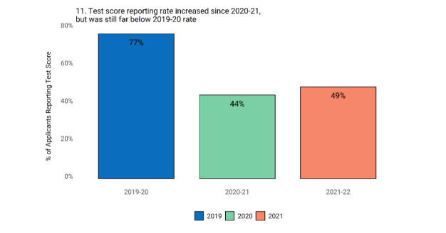 今年,需要标准化考试成绩的大学比例降至5%,而在2019-2020年向Common App提交考试成绩的申请人比例为77%。该比例在2020-2021申请季暴跌至44%,到了今年已恢复至49%。