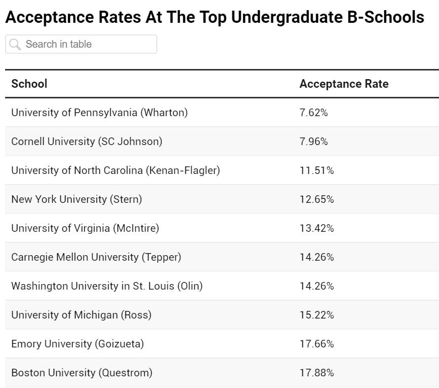 但是很多美国顶尖大学,本科阶段都不开设商科专业。比如:哈佛、耶鲁、普林斯顿大学、哥大、芝加哥大学、杜克、西北等大学的本科阶段都没有商科。 有的学校虽然在本科阶段开设了商科专业,但是申请大一的时候是不能直接申请商学院的,学生需要在经过了一到两年的基础教育/博雅教育后,在大二或是大三的时候再转入商学院学习。比如:加州大学伯克利分校(Haas)、弗吉尼亚大学(McIntire)、圣母大学(Mendoza)、埃默里大学(Goizueta)等。 也有部分美国名校,申请人在申请大一的时候就可以直接申请该校商学院的本科。比如:宾大(Wharton)、纽约大学(Stern)等。不过此类学校,直接申请商科专业难度极大,竞争非常激烈。 那么美国本科可申请的顶尖商学院有哪些?他们的录取难度又是如何呢? 本文根据2020年的录取数据,罗列了全美录取难度最高的10所本科商学院。 在这些顶尖商学院读书,很多学生都是“痛并快乐着”,学习强度高,任务难,但是却能接触到最一流的专业动向,追求有“钱”景的未来。 University of Pennsylvania (Wharton) 2020年,宾夕法尼亚大学沃顿商学院的录取率最低,为 7.62%。但这比上一年的 6.65%录取率要稍微高一些。 Wharton商学院是美国第一所大学商学院。商学院的学生将在宾大的其它11所学院完成三分之一的本科课程,课程涵盖从艺术史到化学等学科,这使学生能够遵循自己的兴趣并获得全面的知识。跨学科的学习让毕业生在职场的适应性更强。 宾大还有非常丰富强大的校友网,据宾大的校友说,同样都是商学院,Wharton学生往往比同龄人显得更成熟、更专业,在就业的市场也倍受青睐。 根据宾夕法尼亚大学官网显示,沃顿商学院MBA毕业生就业率(毕业后三个月)为93.5%;其基础薪资范围130,000 美元至165,000 美元,中位数为150,000美元。 Cornell University (SC Johnson) 紧随沃顿商学院的是,康奈尔大学商学院录取率为7.96%(最低录取率为2019年的 6.41%)。 康奈尔大学在2016年时,便正式宣布校董会投票通过成立全新的“康奈尔商学院”,以加强学校在工商管理、商业教学和创业方面的全球影响力。新的商学院将有将原庄臣商学院、酒店学院和戴森应用经济学院合并成为康奈尔SC庄臣商学院,覆盖从本科到博士后的全阶段各中学位。 这一决定使得康奈尔大学商学院成为仅次于沃顿商学院和哈佛商学院的大规模商学院。 尽管合并到了一起,庄臣商学院提供的课程与之前并没有多大的改变,本科的商学位提供了两个项目:应用经济和管理,酒店管理。 #3 北卡罗来纳大学教堂山分校 (凯南-弗拉格勒商学院) University of North Carolina (Kenan-Flagler) 排在第三名的是北卡罗来纳大学弗拉格勒商学院(Kenan-Flagler),占 11.51%,也高于去年的 10.57%。 Kenan-Flagler商学院是一个国际认可的专业的本科生和研究生水平的全球商学院。自20世纪80年代《商业周刊》(Business Week)开始对商学院进行排名以来,UNC的弗拉格勒商学院就一直保持着前20名的成绩。 2020年,弗拉格勒商学院毕业生的收入从一年前的73,410美元增加到了77,826美元。在录取难度上,该学院2020年只接受了11.51%的申请人,是竞争激烈的美国大学之一。 New York University (Stern) 纽约大学的Stern商学院毗邻金融中心华尔街,跟数百家世界级的金融研究机构及金融企业有关广泛的联系,使得Stern不仅在学术理论领域,而且在金融实践方面都拥有杰出的优势。 Stern商学院在金融方面很突出,它的金融系经常在发展和传播最新的技术与概念知识方面领路。Stern在其他领域也有实力,最突出的是国际商业、信息系统和创业学等。根据细分专业排名,:金融专业全美第2,商科管理、创业学、会计、国际商务、市场营销、金融分析等专业全部全美前10。 University of Virginia (McIntire) 弗吉尼亚大学 McIntire 商学院提供会计、金融、信息技术、管理和营销等专业的商科学士学位。研究方向包括商业、全球商务、会计、信息技术管理和商业分析。 为期两年的 McIntire 课程为本科生提供商业学士学位,重点是会计、金融、信息技术、管理和市场营销和文科课程。UVA的本科生在第二年申请入学;接受后,他们在第三年开始时进入商学院,开始综合核心体验(ICE)课程。在 ICE 期间,学生们与教员和企业领导人一起以小组形式工作,解决现实中的商业问题。在第四年,学生则完成与他们选择的专业相关的课程。 Carnegie Mellon University (Tepper) 在许多人眼里,卡内基梅隆大学是以计算机科学和工程闻名的超级名校。殊不知,CMU的商科也非常强。在CMU斩获的20个诺贝尔奖中,有9个经济学诺奖都与学校的泰珀商学院有关。而在U.S.News的本科商学项目中,CMU的Tepper商学院也是排名全美第7的。 去年,Tepper商科专业学生的平均起薪为90,099美元,与此同时,Tepper也是全美最难录取的本科课程之一。每年大约只有14.26%的申请者最终被录取。 Washington University in St. Louis (Olin) 圣路易斯华盛顿大学奥林商学院(Olin)为学生提供工商管理学士学位。学院中有八个专业可供选择:会计、经济与战略、创业、金融、医疗管理、市场营销、运营与供 应链管理、组织与战略管理。学生可以根据自己的目标和兴趣来定制课程。 University of Michigan (Ross) 密歇根安娜堡的罗斯商学院(Ross)连续多年稳居全美本科商科排名前5名,细分专业中,市场营销专业全美第1,商业管理、会计、金融、创业学等全部全美前5。 Ross商学院喜欢将学生
